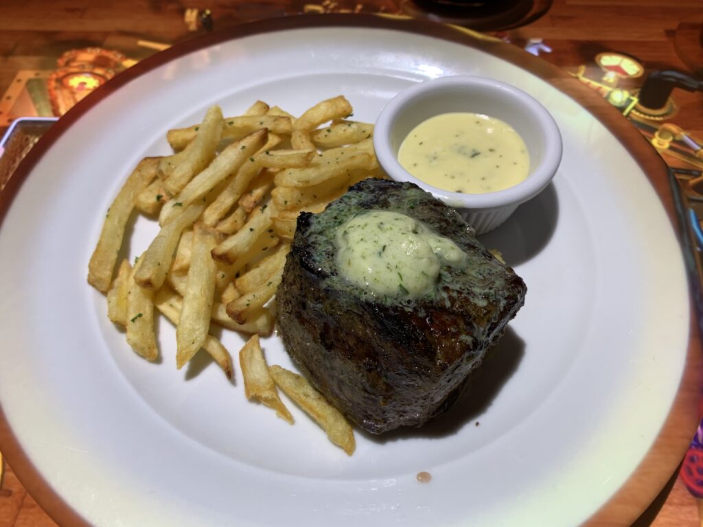 下にプロジェクションマッピングでステーキを作っている映像と実際テーブルに出されたステーキの写真を載せましたのでご覧いただければと思います。