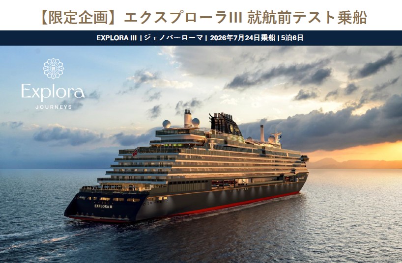 2026年8月3日にバルセロナからの就航を控えたエクスプローラジャーニー待望の最新造船、エクスプローラIII。2027年秋には太平洋を渡り、日本を含むアジア初就航も予定されています。就航コースを前に、同船のテスト乗船の機会が限定企画として発表されました。話題のエクスプローラIIIに世界で初めて乗船するお客様として、ぜひ、ご検討ください。