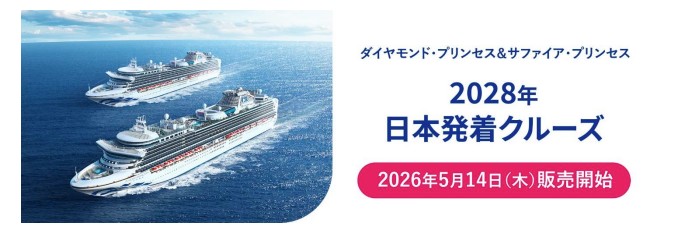 プリンセス・クルーズは、日本で建造された姉妹船「ダイヤモンド・プリンセス」と「サファイア・プリンセス」の 2 隻が東京を母港として、2028 年日本発着クルーズを運航することを発表しました。2028 年 2 月29 日(火)~2028 年 11 月 11 日(土)出発の期間で、全 40 コースを設定し、韓国と台湾を含む計 3 カ国 39都市を訪れます。また、「マックス早期予約割引」や「スーパー早期予約割引」、「早期予約割引」、「3~4 人目特別料金」などのお得なプランをご用意しています。2026 年 5 月 14 日(木)より販売を開始する予定です。