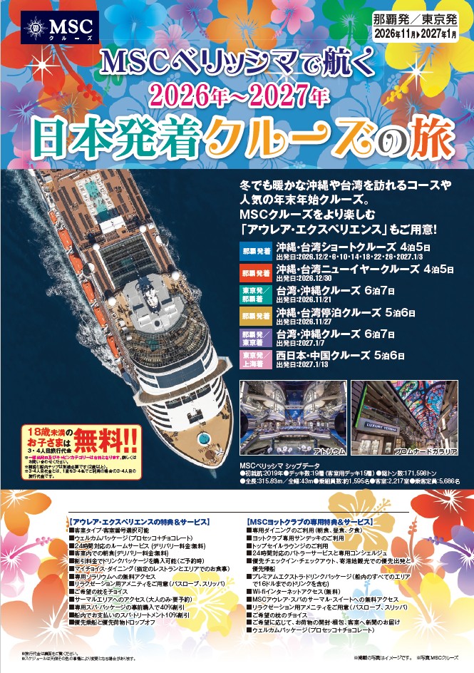 ◆2019年就航のMSCの次世代客船プロジェクトとして4隻目の客船ベリッシマでの東京発台湾・沖縄クルーズ。 ◆大人2名と同室の3~4人目のお子様(18歳未満)は、ヨットクラブ以外のキャビンクルーズ代金無料!(港湾税、船内チップは別途かかります) ◆MSCクルーズをより楽しむ「アウレア・エクスペリエンス」もご用意! |