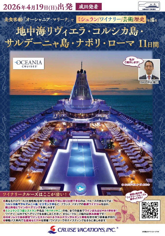 2026年04月25日(土) | アジャクシオ入港 【午前】アジャクシオ観光 【午後】「ドメーヌ・コント・ペラルディ」にてワインテイスティング&ブドウ畑ピクニック昼食。その後、港へ。 アジャクシオ出港 |