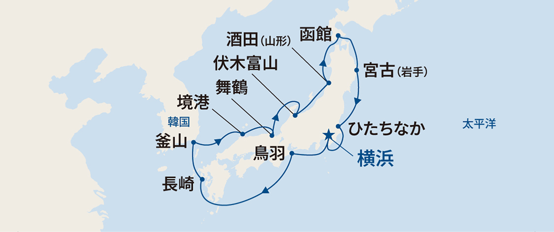 航路 | 横浜~鳥羽~クルージング~長崎~釜山(韓国)~境港~舞鶴~伏見富山~酒田(山形)~函館~宮古(岩手)~ひたちなか~横浜 |