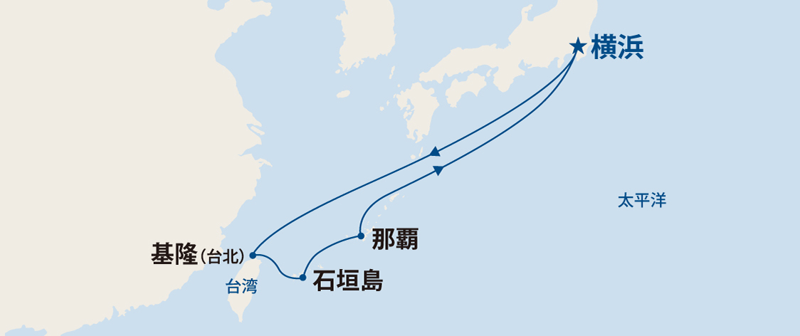 航路 | 横浜~ クルージング~ クルージング~ 基隆(台北)(停泊) ~ 石垣島~ 那覇~ クルージング~ クルージング~ 横浜 |