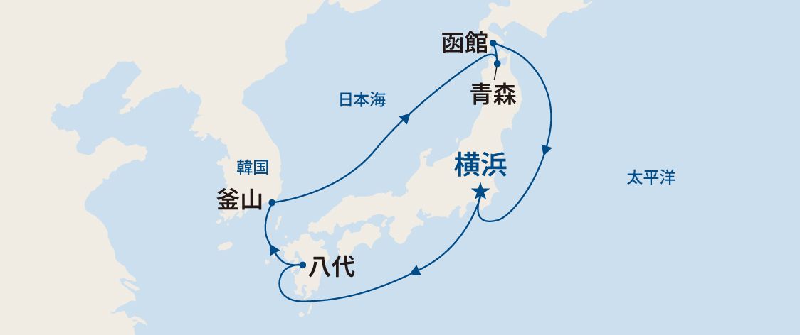 航路 | 横浜~ クルージング~ 八代~ 釜山~ クルージング~ 青森(青森ねぶた祭) ~ 函館(函館港まつり) ~ クルージング~ 横浜 |
