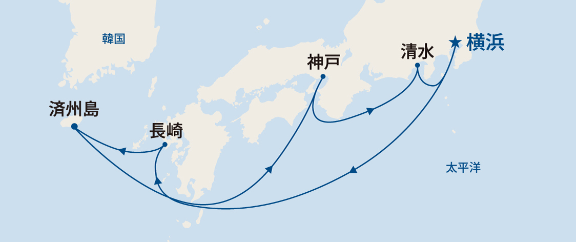 航路 | 横浜~ クルージング~ 長崎~ 済州島~ クルージング~ 神戸~ 清水~ 横浜 |