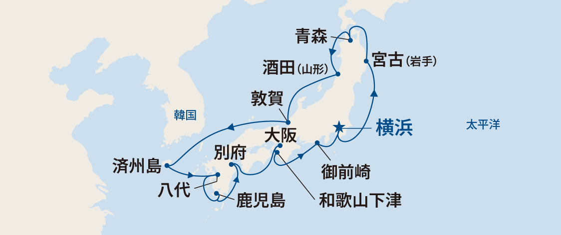 航路 | 横浜~ クルージング~ 宮古(岩手) ~ 青森~ 酒田(山形) ~ 敦賀~ クルージング~ 済州島~ 八代~ 鹿児島~ 別府~ 大阪~ 和歌山下津~ 御前崎~ 横浜 |