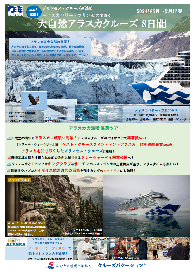 ◆アラスカに就航55周年!「ベスト・クルーズライン・イン・アラスカ」17年連続受賞、アラスカを知り尽くしたプリンセス・クルーズに乗船! ◆環境基準を満たす限られた船のみが入域できるグレーシャーベイ国立公園もクルーズ! ◆建築物やパブなどイギリス統治時代の面影を残すカナダのビクトリアにも訪問! |