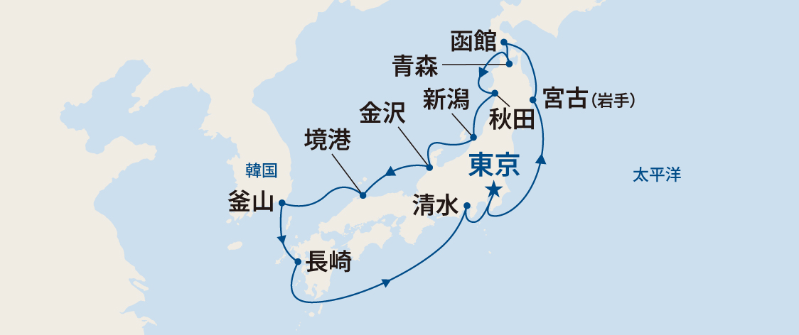航路 | 東京~ クルージング~ 宮古(岩手) ~ 函館~ 青森~ 秋田~ 新潟~ 金沢~ 境港~ 釜山~ 長崎~ クルージング~ 清水~ 東京 |