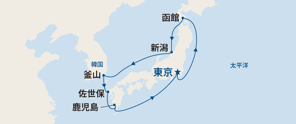 航路 | 東京~ クルージング~ 函館~ 新潟~ クルージング~ 釜山~ 佐世保~ 鹿児島~ クルージング~ 東京 |