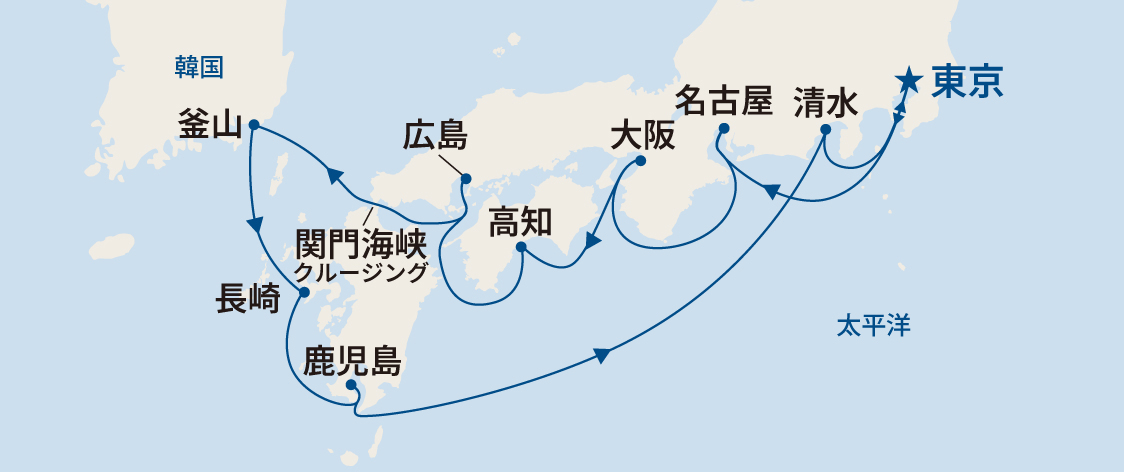 航路 | 東京~ 名古屋~ 大阪~ 高知~ 広島~ 関門海峡クルージング~ 釜山~ 長崎~ 鹿児島~ クルージング~ 清水~ 東京 |