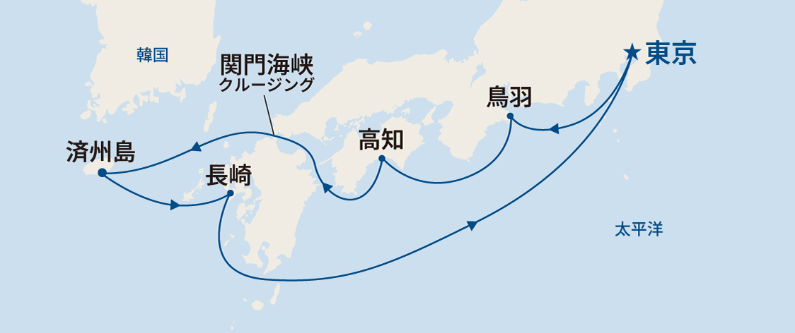 航路 | 東京~ 鳥羽~ 高知~ 関門海峡クルージング~ 済州島~ 長崎~ クルージング~ 東京 |