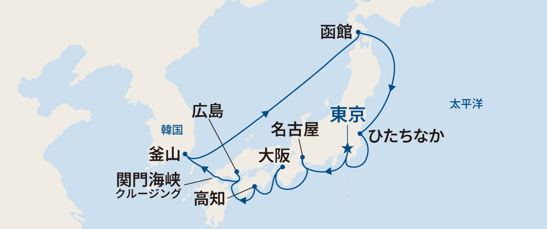 航路 | 東京~ 名古屋~ 大阪~ 高知~ 広島~ 関門海峡クルージング~ 釜山~ クルージング~ 函館(函館港まつり) ~ クルージング~ ひたちなか~ 東京 |