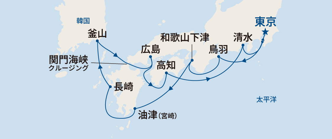 航路 | 東京~ 鳥羽~ 和歌山下津~ 油津(宮崎) ~ 長崎~ 釜山~ 関門海峡クルージング~ 広島~ 高知~ 清水~ 東京 |