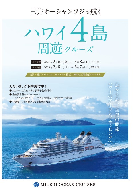 航路 | 横浜~クルージング~クルージング~クルージング~クルージング~クルージング~クルージング~クルージング~クルージング~ホノルル(停泊)~ホノルル(停泊)~コナ~クルージング~ナウィリウィリ~クルージング~ヒロ~マウイ(カフルイ)~ホノルル~クルージング~クルージング~クルージング~クルージング~クルージング~クルージング~クルージング~クルージング~クルージング~横浜 |