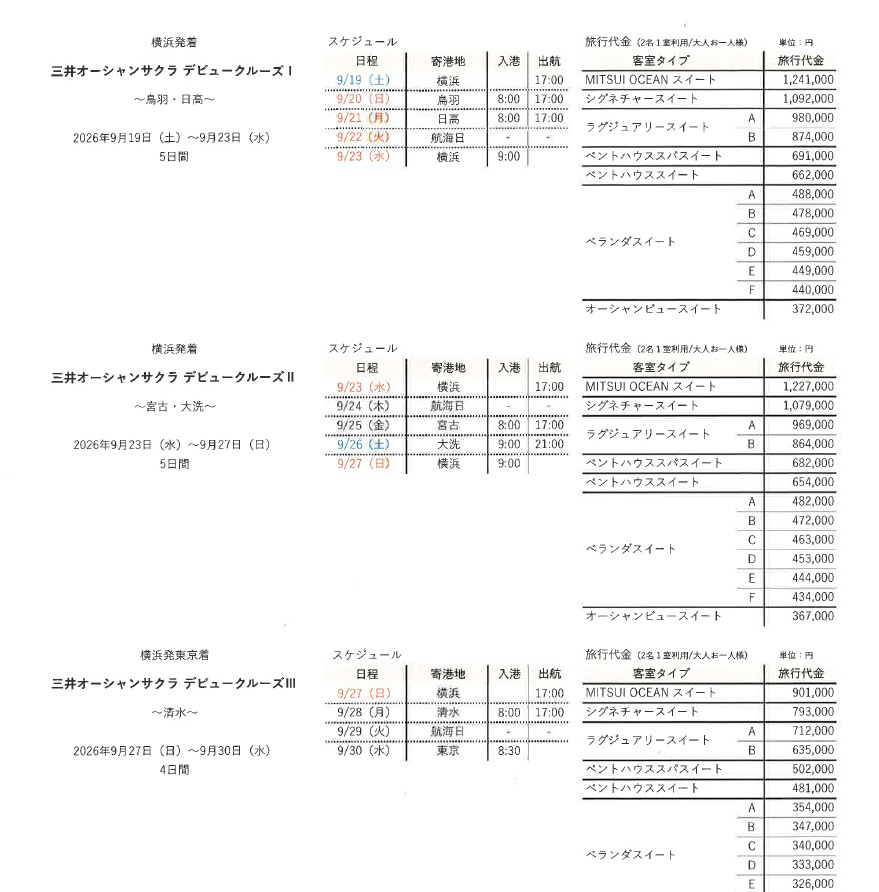 <三井オーシャンサクラ デビュークルーズ> 三井オーシャンサクラは、2026年9月に日本籍船として運航を開始します!! ★一般発売は、1月19日(月)を予定しております。 |